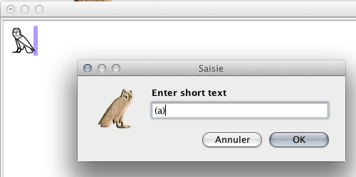 È abbastanza comune aggiungere piccole annotazioni, come "tr" o "sic", o riferimenti a note a piè di pagina, come "(a)", nei testi geroglifici. Per farlo in JSesh, usa la voce di menu Inserisci/testo breve