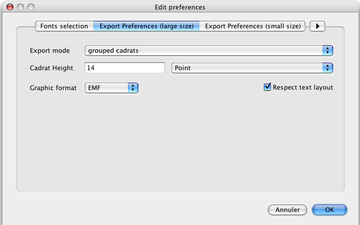 Le impostazioni per "dimensione grande/dimensione piccola/wysiwyg" possono essere modificate nelle preferenze. Ci sono due schede, una per la dimensione "piccola" e l'altra per la dimensione "grande". La modalità "wysiwyg" utilizza le impostazioni per la dimensione grande.